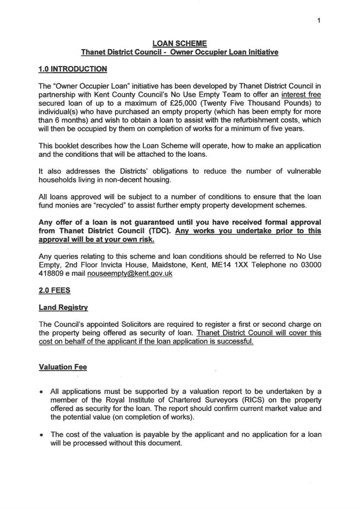The “Owner Occupier Loan” initiative has been developed by Thanet District Council (TDC) in partnership with Kent County Council’s No Use Empty Team to offer an interest free secured loan of up to a maximum of £25,000 (Twenty Five Thousand Pounds) to individual(s) who have purchased an empty property (which has been empty for more than 6 months) and wish to obtain a loan to assist with the refurbishment costs, which will then be occupied by them on completion of works for a minimum of five years.